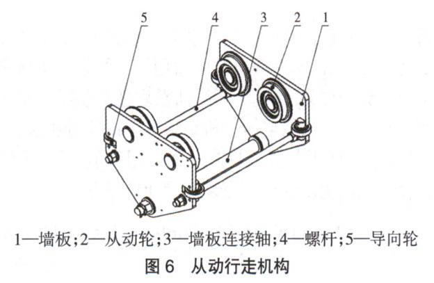 從動行走機構不提供動力,主要作用是從結構上保持葫蘆行走過程的穩定。主要結構如圖6所示,2個墻板、1個墻板連接軸以及2個螺桿組成從動行走機構的主框架,每個墻板上分別固定有2個對稱布置的從動輪,和2套導向輪,從動輪踏面直徑和主動行走輪踏面直徑保持一致,保證在葫蘆行走過程中,從動輪和主動行走輪同步運行。
